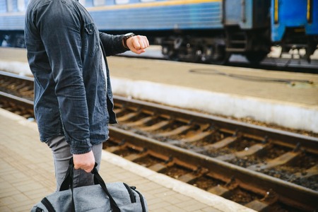 travel concept. man hold bag close up on railway station