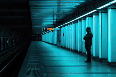 Man stand waiting train in subway fast moving. Generative AI.