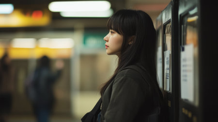A woman standing in a subway station with her back to the camera, AI