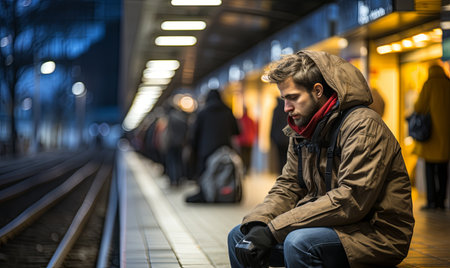 Long exposure of lonely man at subway station with blurry train and walking people. Generative AI