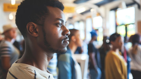 African American man at polling place. Black male voter preparing to cast his vote. Citizen waiting in line. Concept of election, civic duty, democratic process, voting rights, diversity. Copy space