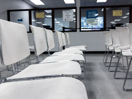 Bellevue, WA / USA - circa November 2019: Bellevue DMV waiting room with white chairs, nobody is around.