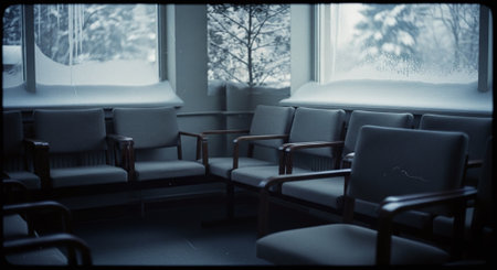 A quiet waiting room with empty gray chairs, snow visible outside the windows, creating a serene winter atmosphere