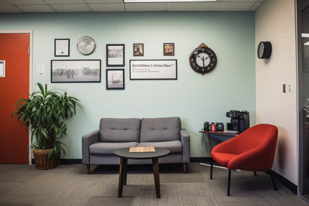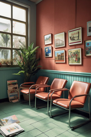 health concept with a serene waiting area adorned with cozy chairs and a variety of reading materials for patients to browse while they wait