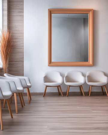 A bright and spacious room showcases modern white chairs with wooden legs arranged neatly. A large wooden-framed mirror reflects the serene atmosphere enhancing the design.