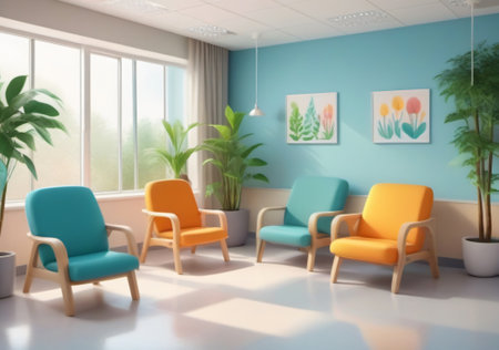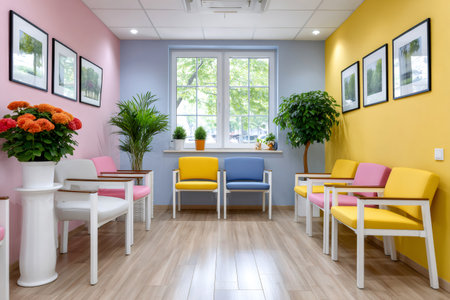 Modern colorful empty patient waiting room with chairs and green plants in a hospital clinic