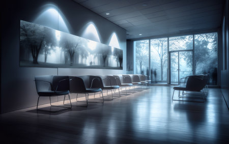 A serene and empty hallway featuring chairs aligned under soft blue lighting. This tranquil scene evokes feelings of solitude and quiet reflection in an indoor space.