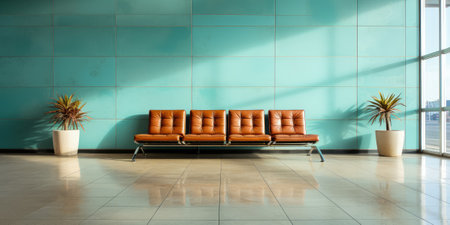 Empty waiting area in terminal International Airport. Modern lounge wait room with seats. No passengers, no vacation. Concept Air Transportation industry. Copy text space