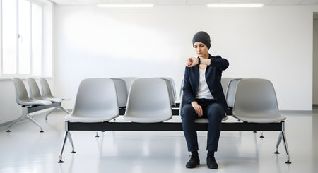 A woman wearing a beanie, who appears to be a patient, sits alone in a stark, empty hospital or clinic waiting room, anxiously checking the time on her watch. The minimalist setting emphasizes feelings of loneliness, uncertainty, and the anxiety of waiting for medical results.