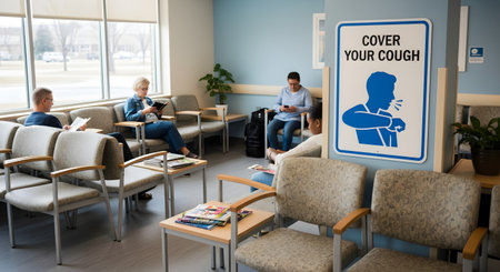 A bright and clean doctor's office or clinic waiting room with several patients sitting in chairs, reading or using their phones. A prominent blue sign on the wall instructs people to Cover Your Cough.