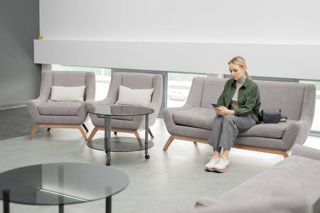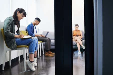 Pre interview process. ta group of people using their devices while waiting to be interviewed in a modern office.