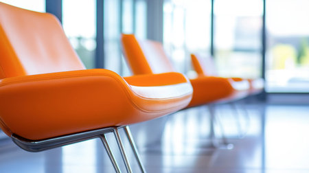Modern orange chairs create a vibrant atmosphere in a waiting area, emphasizing comfort and style. The sleek design enhances the inviting space.