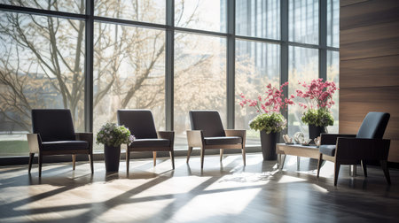 sleek office waiting illustration black arranged, line windows, floor to sleek office waiting
