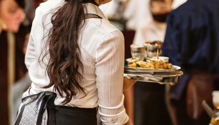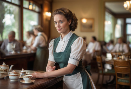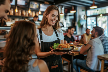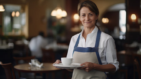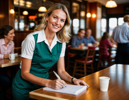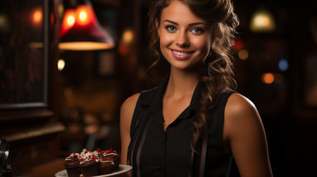 A confident waitress in a restaurant, wearing her uniform and serving with a smile.