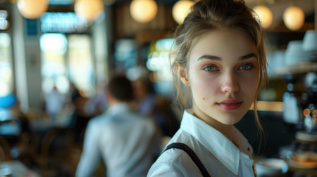 Close-up portrait of a young French female waitress with a gentle expression, captured in a bustling cafe setting.