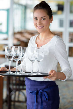 beautiful girl-waiter takes a tray of champagne with glasses