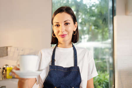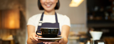 Cropped shot, female barista hands holding cup of coffee, giving you drink, serving in cafe, wearing uniform