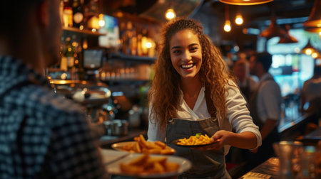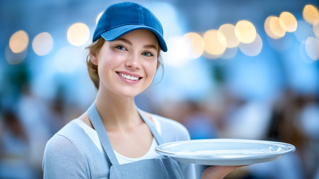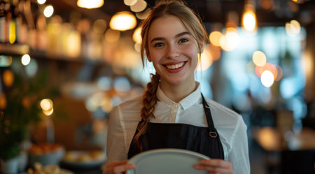 Waitress smiles while presenting a clean plate in a lively restaurant. Welcoming ambiance with warm bokeh lights and patrons in background. Concept of hospitality, dining experience, food service.