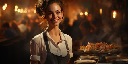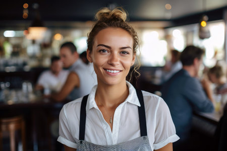 photo of a restaurant with waitress on focus smiling.Generated by AI