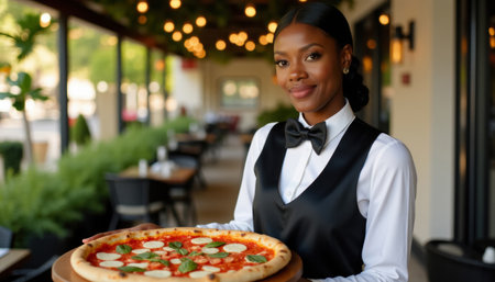 Portrait of young waitress holding pizza in cafe. Young african american waitress wearing uniform and bow tie.