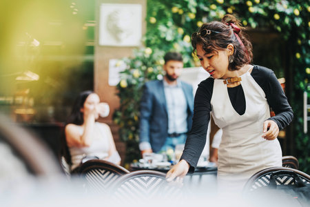 Professional waitress serving coffee on a tray in a bustling outdoor cafe setting