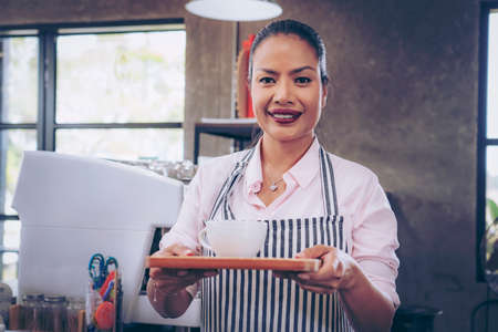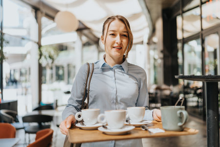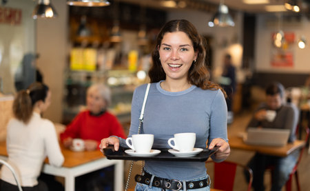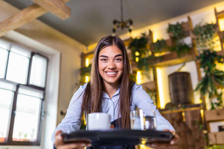 Happy waitress holding tray with cup of coffee, working in cafeteria and serves the table