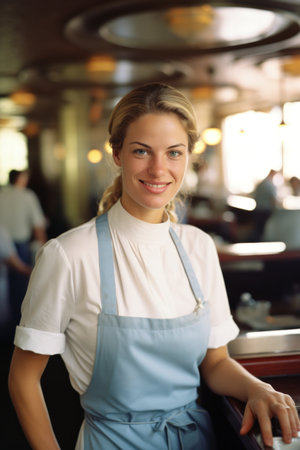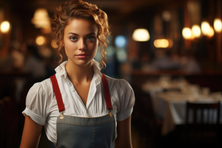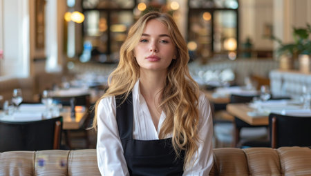 Portrait of a beautiful waitress standing in a restaurant, looking at camera.