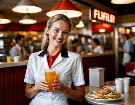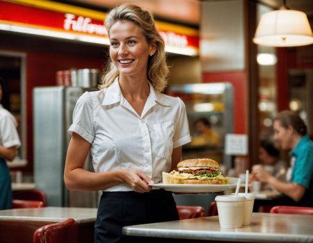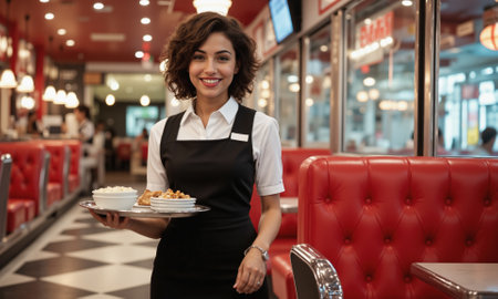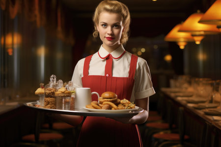 photo of beautiful woman as a waitress serving food in retro dining restaurant, generative AI