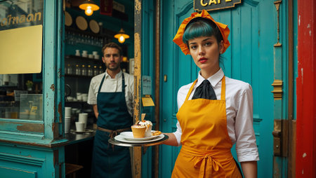 Young waitress serving a dessert in a vintage cafe, her colleague waiting inside. Ai generated image