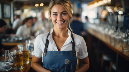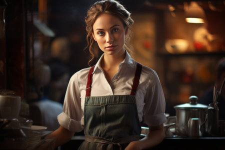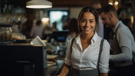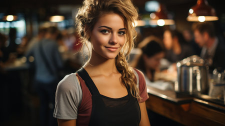 A woman proudly stands in front of a bar, confidently wearing an apron, Waitress in coffee shop, AI Generated