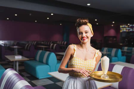 cheerful pin up waitress holding tray with milkshake in cafe