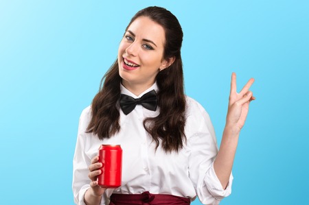 Young beautiful waitress with a can on colorful background