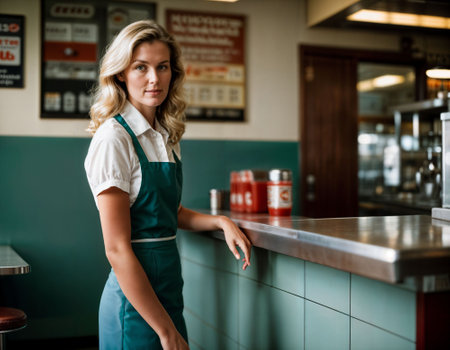 photo of beautiful woman as a waitress standing in retro dining restaurant, generative AI