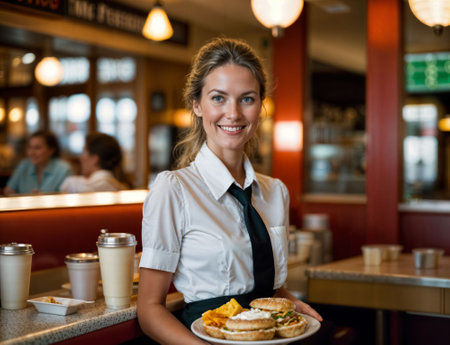 A confident waitress professionally serving in a cafeteria.