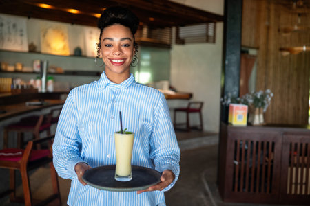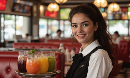 Waitress with smoothies on a tray in a stylish eatery offering friendly service and a cozy vibe