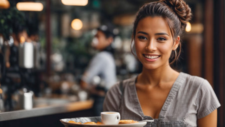 Smiling barista serves coffee with warmth in cozy cafe during the morning rush in downtown
