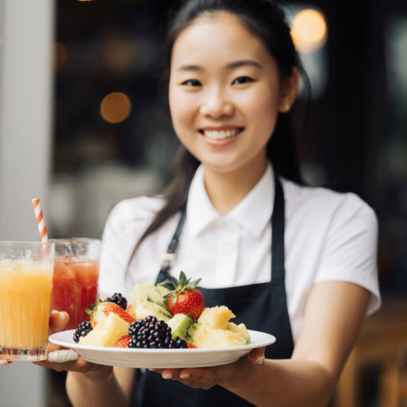 Young asian waitress holding a plate of fresh fruits and smoothies