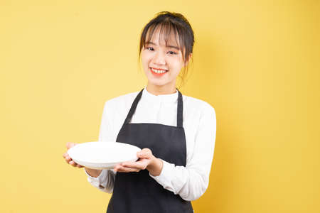 Asian smiling female entrepreneur or barista wearing an apron over white background, concept small business
