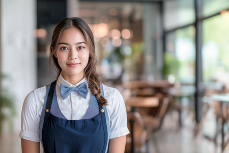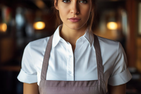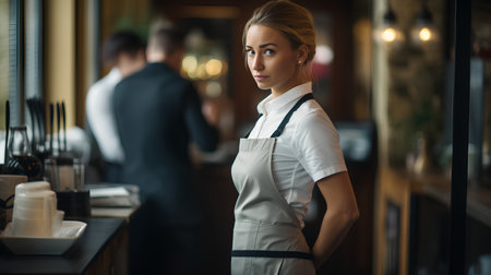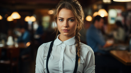 Portrait of a beautiful young waitress standing in a cafe or restaurant