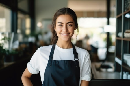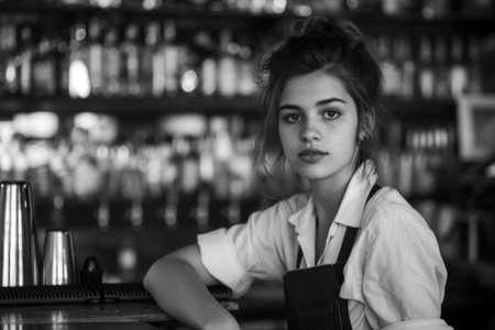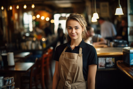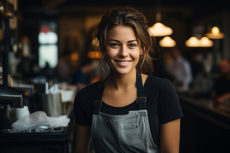 Candid photo of a female bartender wearing an apron, standing in front of a fully stocked bar, Waitress in coffee shop, AI Generated