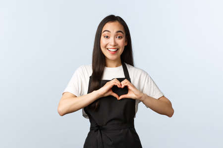 Coffee shop, small business and startup concept. Cute and caring young asian female cafe employee love coworkers or clients, showing heart sign over chest, wearing black apron