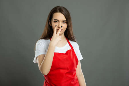 Funny woman in apron. Young woman wearing apron showing tongue and pointing left