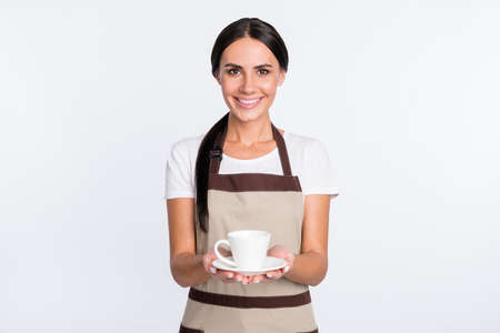 Photo of charming positive girl arms hold give you coffee toothy smile look camera isolated on white color background