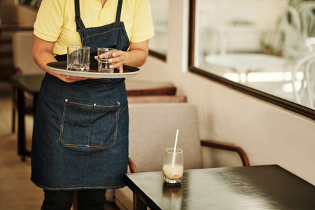 Cropped image of cafe waitress collecting dirty glasses from tables