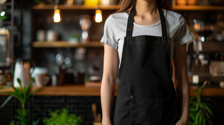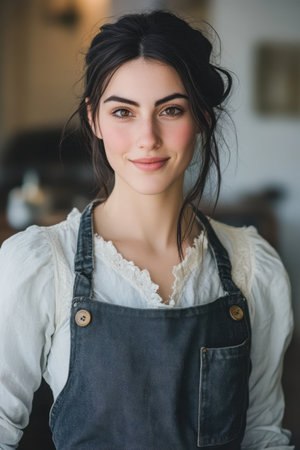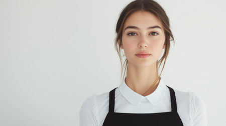 Young woman in a black apron poses confidently against a light background during a casual indoor setting