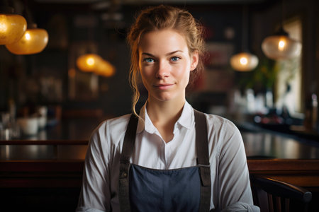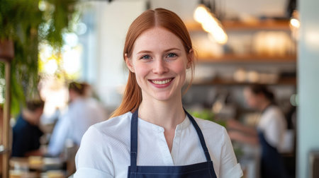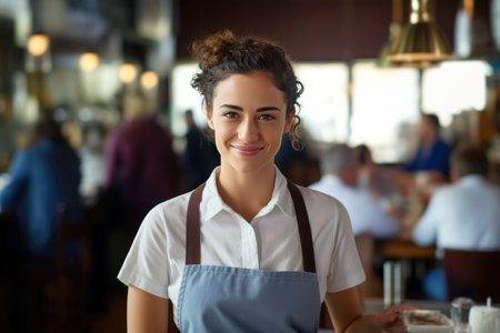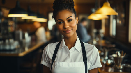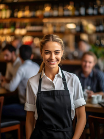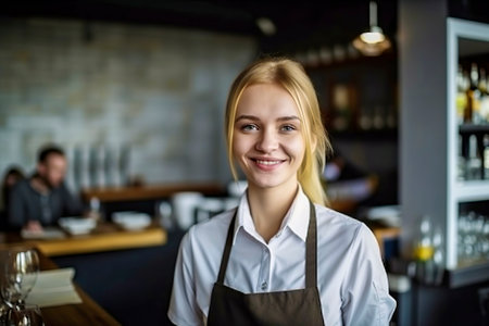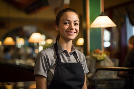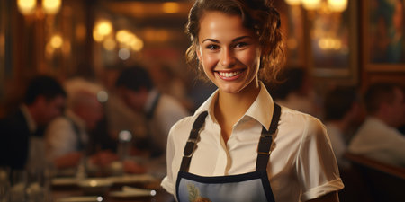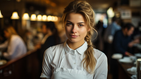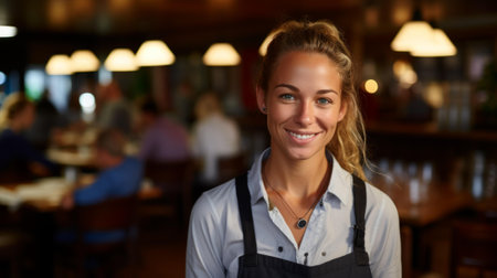 photo of a restaurant with waitress on focus smiling.Generated by AI