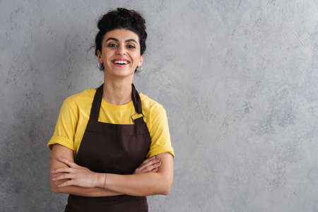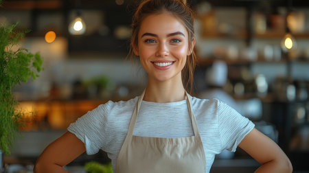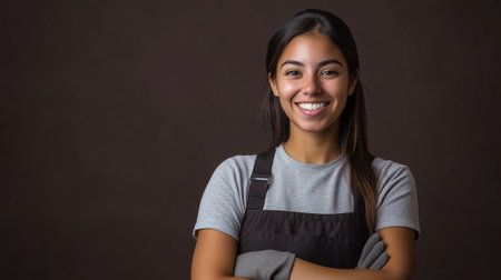 A confident young woman in a black apron stands against a simple background. She smiles warmly, embodying a professional yet approachable demeanor ideal for hospitality.