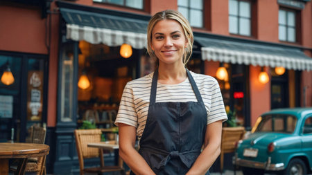 Successful small business owner or waitress proudly standing in front of their cafe or coffee shop.