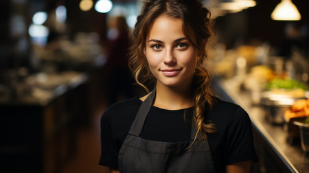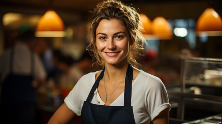 Smiling young woman wearing apron stands in busy restaurant kitchen. Warm lighting and blurred background create an atmosphere of teamwork and energy. Ideal for culinary, hospitality
