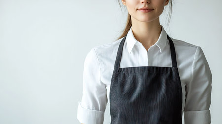 Woman in empty apron. Kitchen or restaurant worker with copyspace apron. Copy space in white uniform. Waiter wearing black mockup wear for brand or label